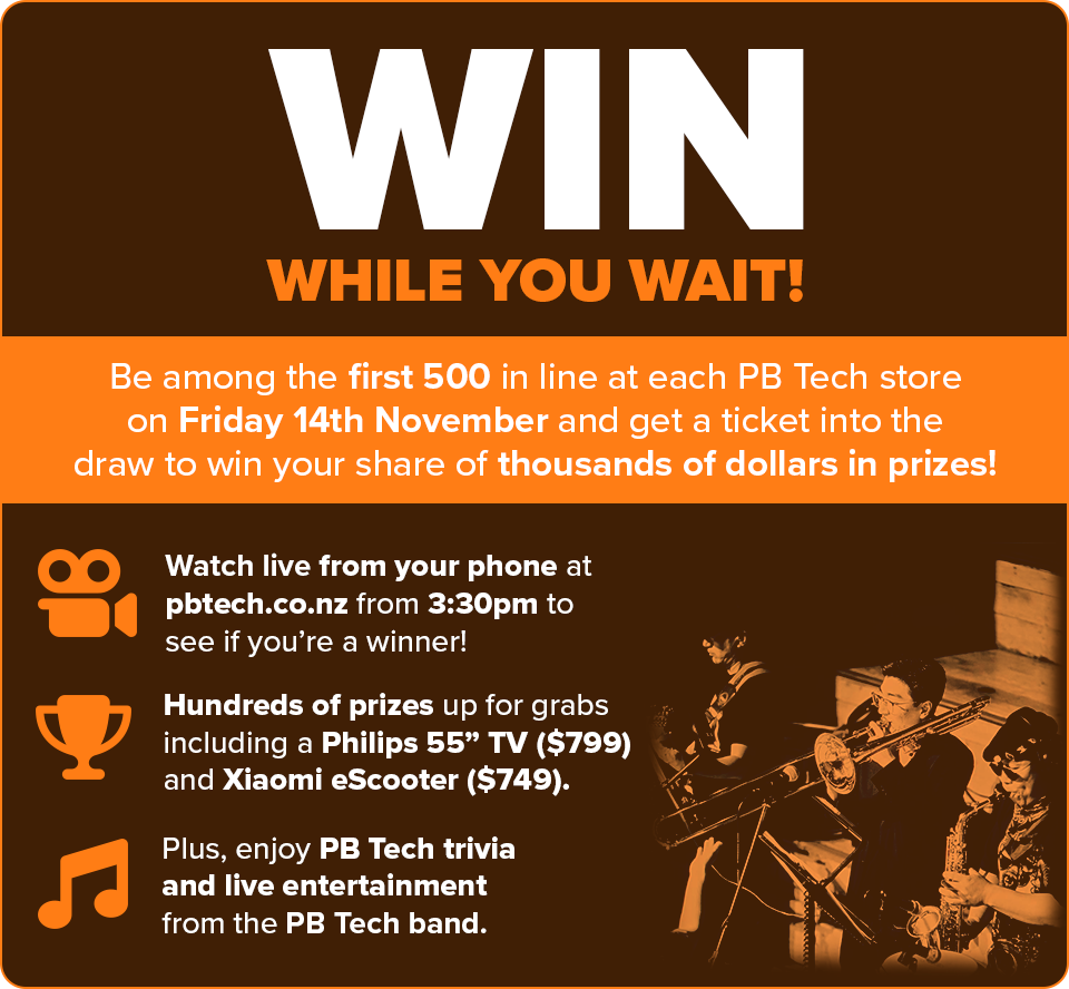 Plus, win while you wait by joining the Black Friday queues outside PB stores on November 14th. The first 500 customers in line at each store (excluding Auckland Airport) get a ticket to the live prize draw from 3:30PM to 5PM, with hundreds of prizes including a Philips 55" 4K TV worth $799 and a Xiaomi eScooter worth $749.
