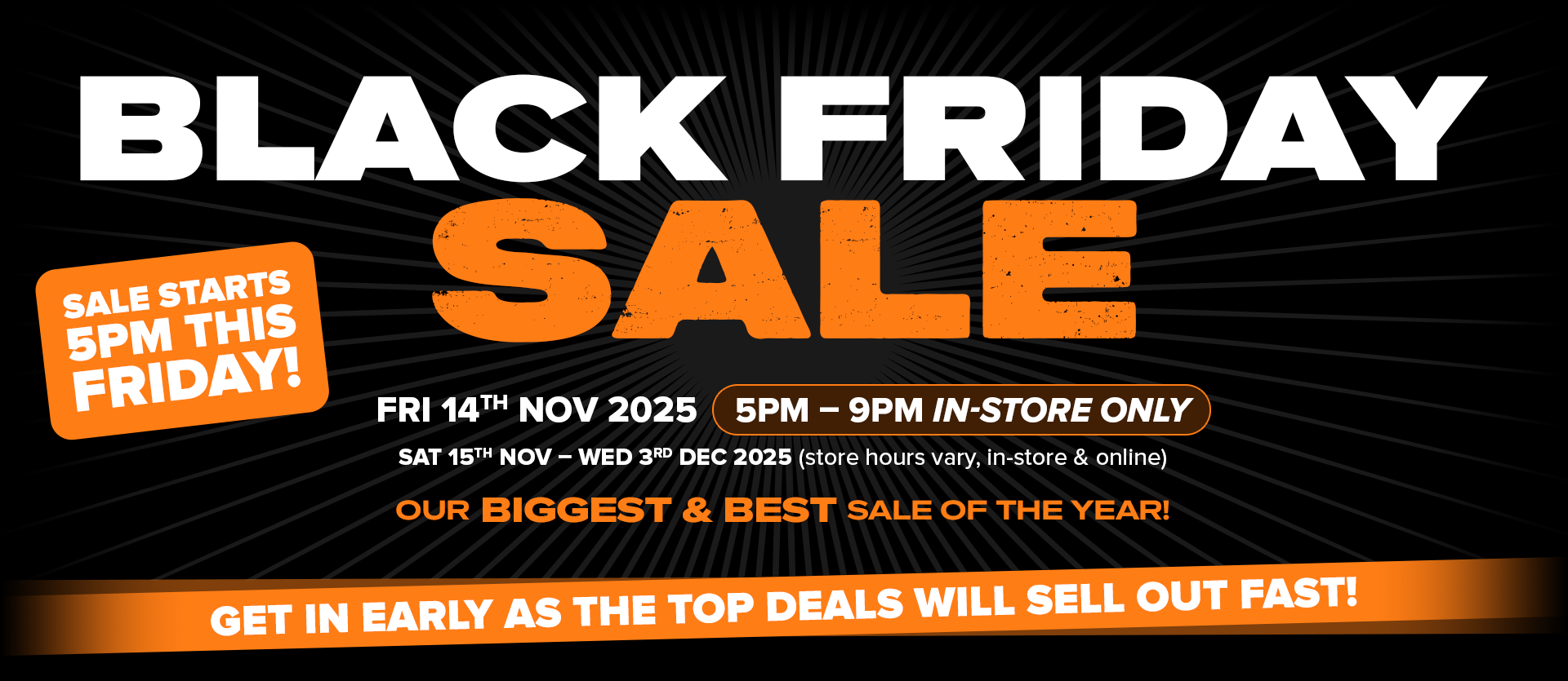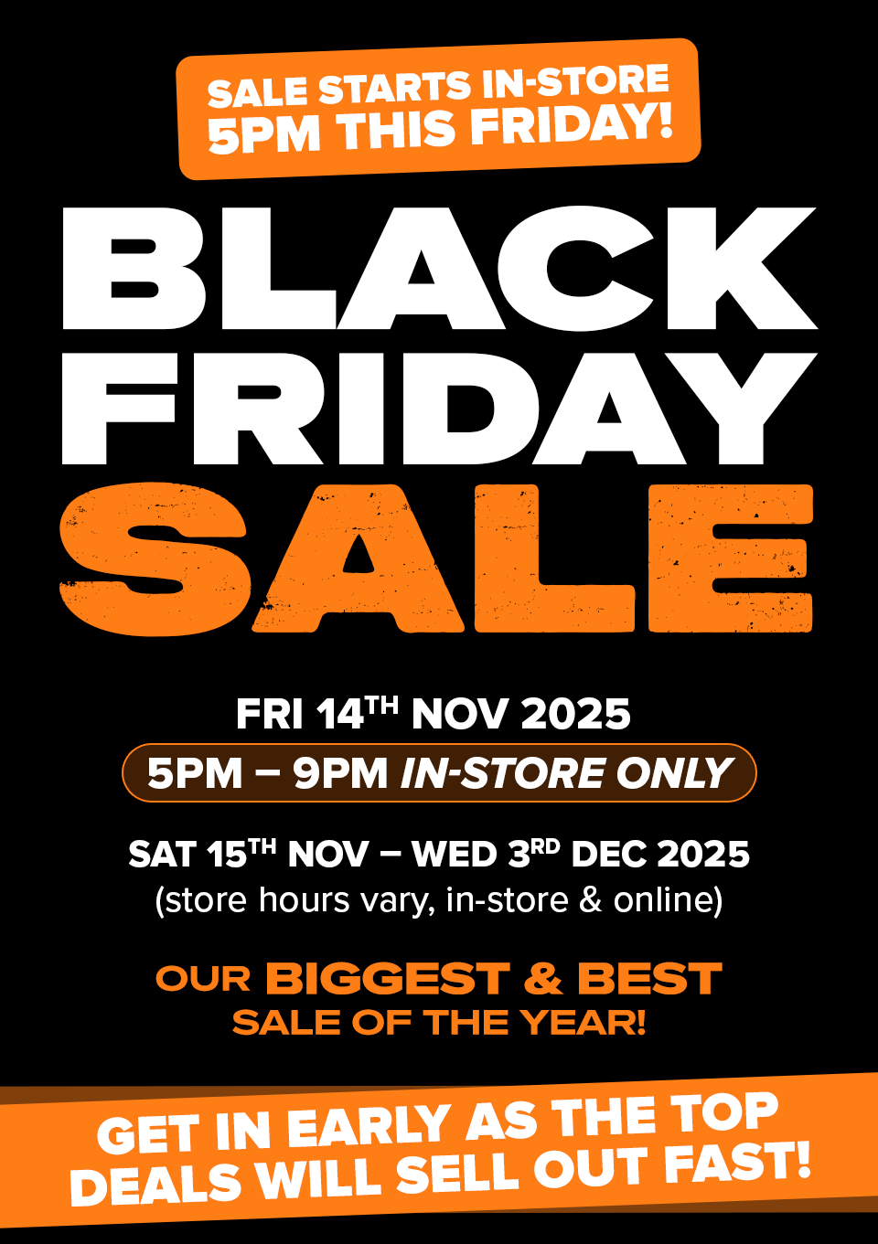 Our Black Friday Sale will begin IN-STORE ONLY this Friday from 5PM. If you can't make it in-store, you can shop online from 9PM the same day.